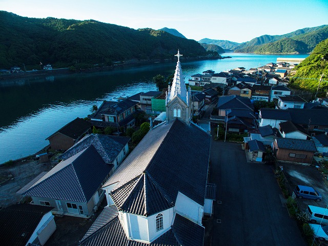 2018年7月「長崎と天草地方の潜伏キリシタン関連遺産」の構成資産として世界文化遺産に登録された﨑津集落。その象徴として静かに佇むのが、重厚なゴシック様式のカトリック﨑津教会です。現在の教会は昭和9(1934)年、フランス人宣教師ハルブ神父のもとで再建されたもの。畳敷きの堂内は国内でも珍しく、色鮮やかなステンドグラスから柔らかな光が射し込み、厳かで穏やかな空気に包まれています。穏やかな羊角湾を望むその姿から、「海の教会」としても親しまれています。