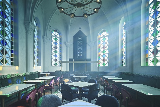 美しく煌めくステンドグラスに、約10mもの天井高をもつ、かつては聖堂だった空間を活かしたレストラン。