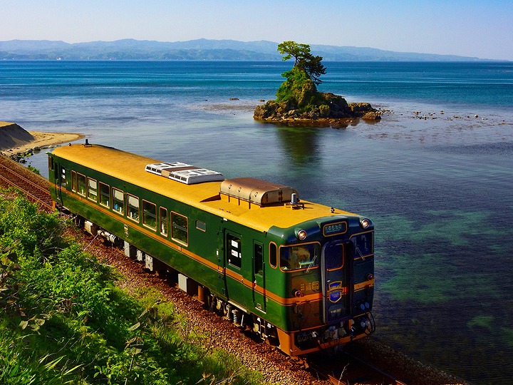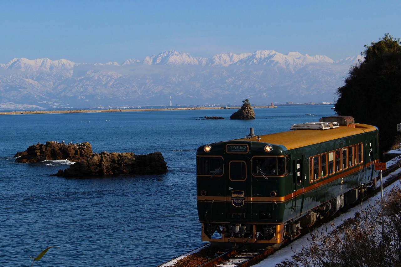 高岡駅を起点に、山側に伸びる城端線がありますが、今回の真結の旅では海側に伸びる氷見線に乗車します。このエリアの特徴である「美しい山と海」をフランス語で表現した「ベル・モンターニュ・エ・メール」(愛称/べるもんた)。沿線の海岸や山々の風景は美しく、四季折々、時間によって刻々と変わる美しい車窓はまさにアート。天候が良ければ世界でも稀な「海越しの3,000m級の立山連峰」の絶景を見ることができます。