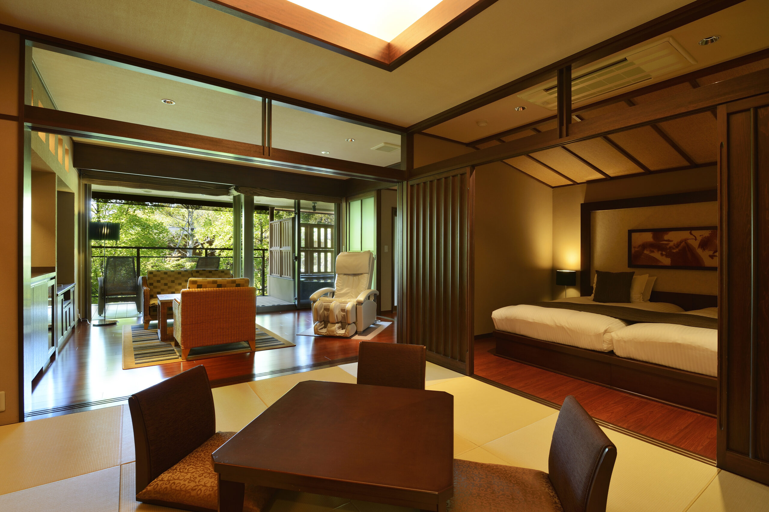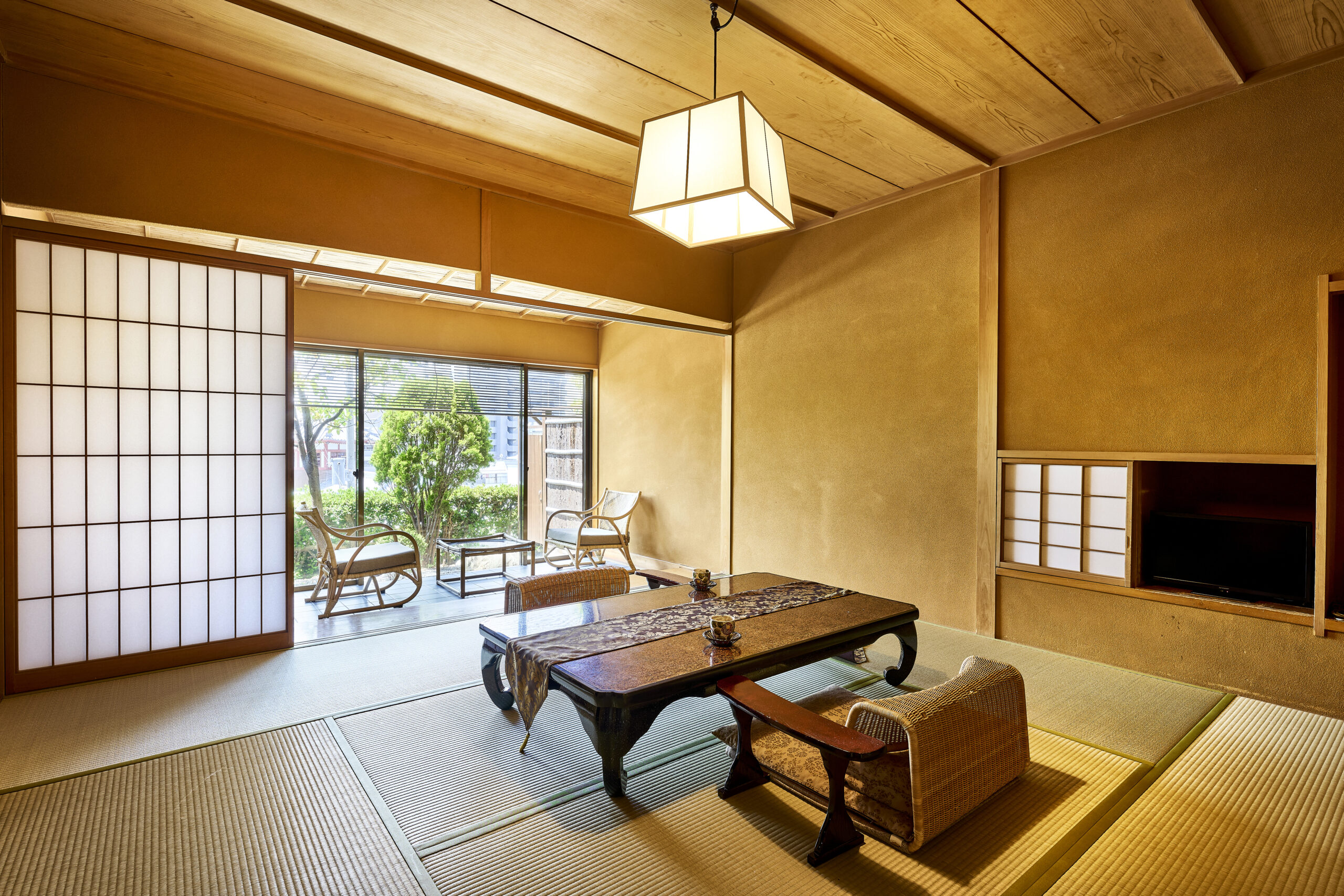 数寄屋建築の名匠・山口修氏が手がけた客室は、職人の技と遊び心がちりばめられた総檜数寄屋造り。室内には道後ゆかりの作家をはじめ、古今東西の貴重な書画・骨董品類を設えております。