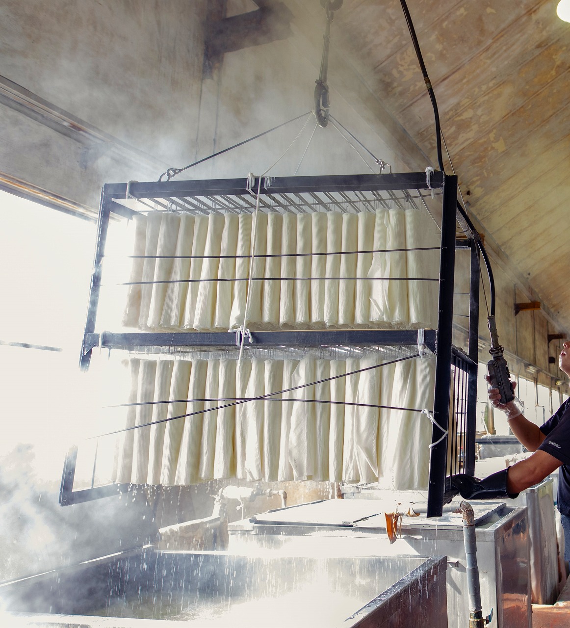 工場精練場内織り上がった生糸の繊維に含まれている不純物とたんぱく質の一種である「セリシン」を、石けんなどの薬品を加えた熱湯の中で洗い落とす工程を精練と言います。