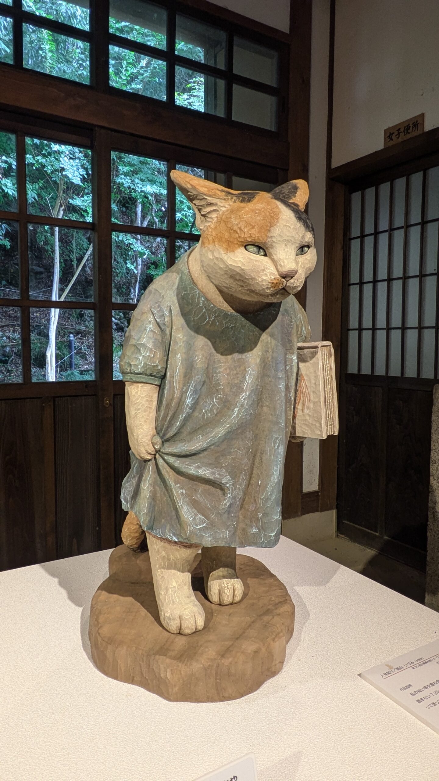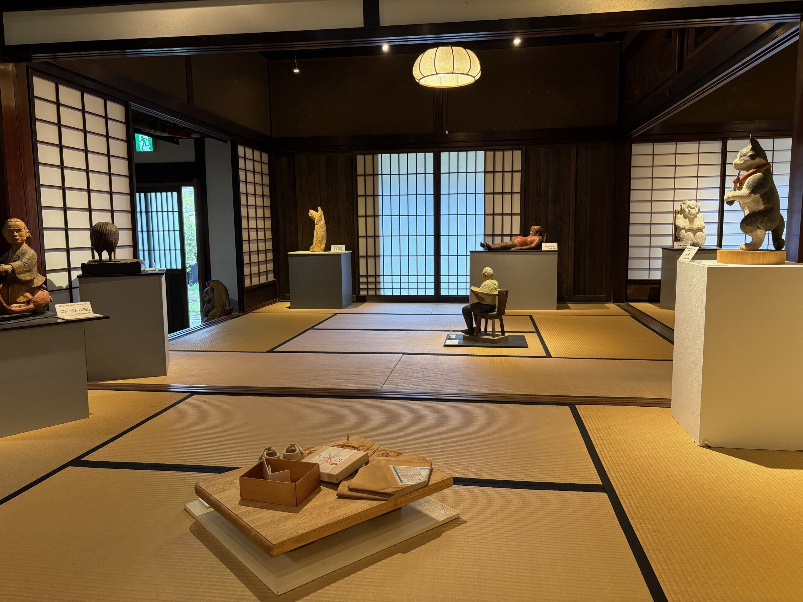 愛らしい動物の木彫り作品が築120年の診療所跡建物に展示されています。