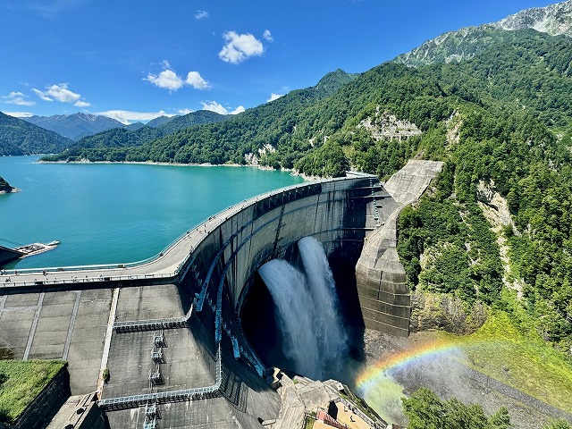 通称「くろよん」とも呼ばれる高さ日本一を誇る黒部ダムは、えん堤の高さ186m、長さ492 mの堤から放水が行われ、夏の晴れた日には水しぶきに光が乱反射し、キラキラした虹が現れることもあります。。総工費513億円、7年もの歳月をかけ、1000万人もの人の手によって建設されたアルペンルートの名所になっています。