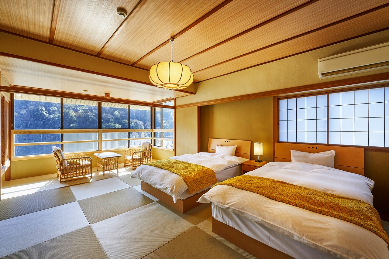 和室ツイン (お部屋一例)琉球畳敷き、広さ40平米のツインベッドタイプのお部屋。セミダブルタイプのベッドで、快適な眠り。窓側にはくつろぎのスペースが用意されており、ゆるやかに流れる三朝側を眺めながらお寛ぎいただけます。