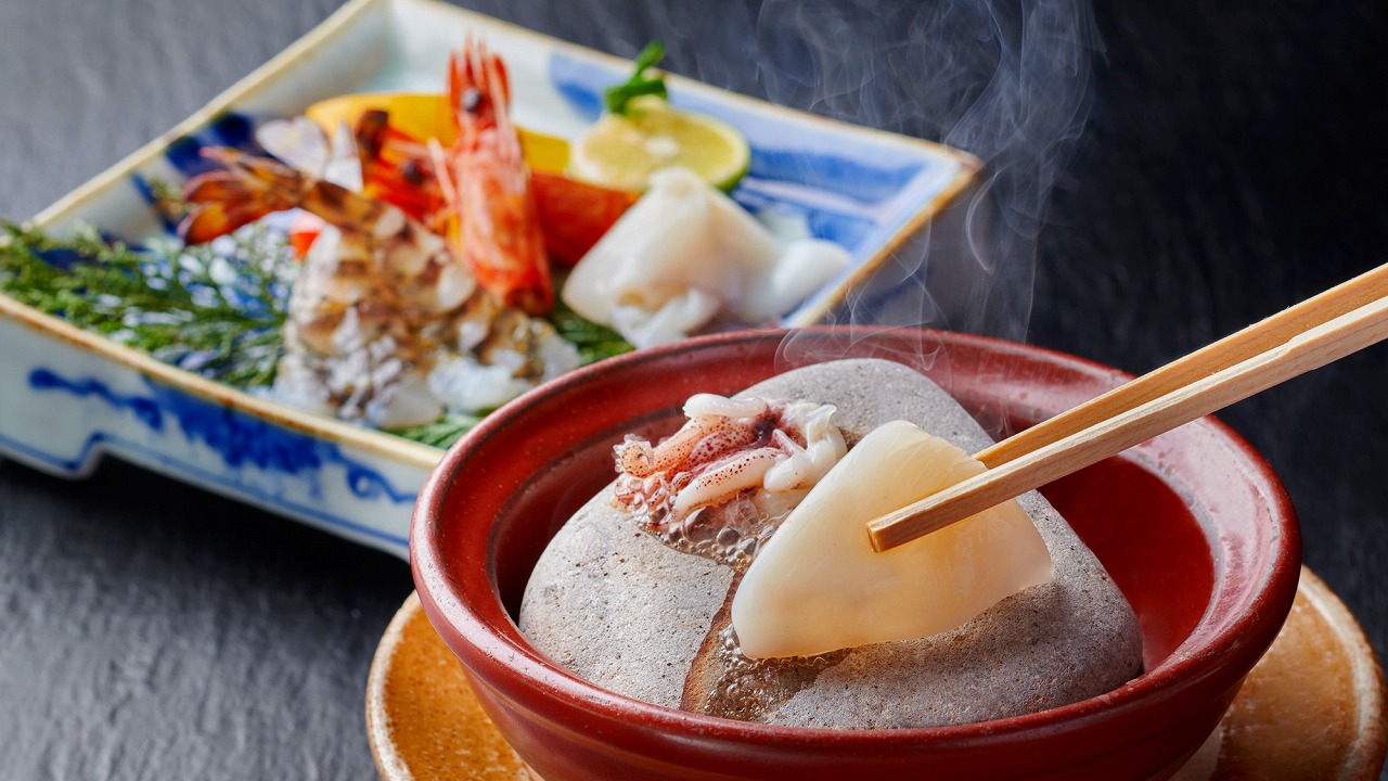 名物料理:海鮮石焼(イメージ)海鮮石焼のルーツといわれる万翆楼の名物料理。ヤリイカ、車海老、あわび、鳥取牛などの食材を、熱々の石で焼いてお召し上がりいただきます。酒盗の特製出汁が素材の味を引き立たせます。