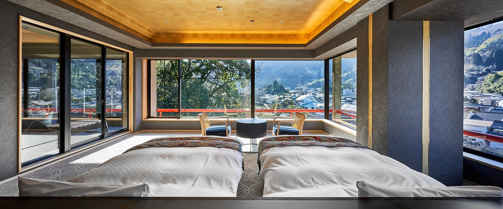 三朝スイート(お部屋一例)角部屋に位置し、三朝温泉街を臨むパノラマビューをお楽しみいただけるお部屋と、車椅子でも移動できるユニバーサルデザインの2タイプがあります。室内には、専用露天風呂、和室タイプのベッドルーム、リビングスペースを設けてあります。