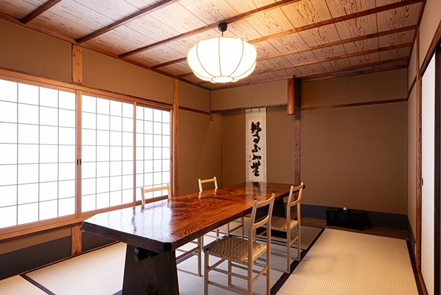 賑やかな銀閣寺周辺の喧騒を離れ、暖簾をくぐると、そこには凛とした静寂が広がっています。心落ち着く和の情緒に包まれた空間でゆっくりとお食事をお召し上がりいただきます。