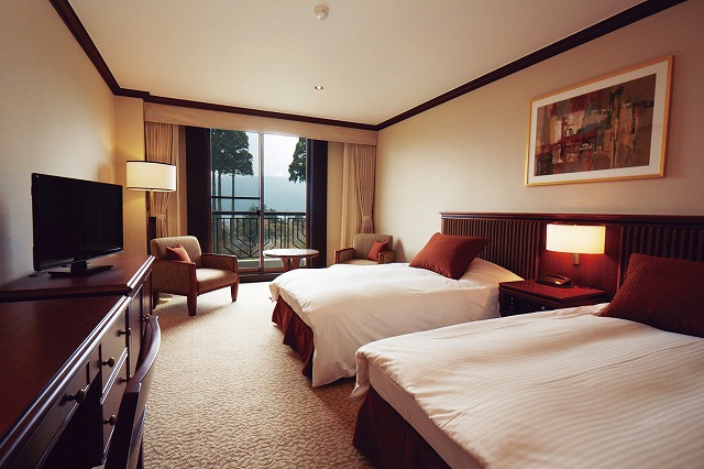 ラウンで統一された歴史あるホテルならではの落ち着きが感じられる客室で、大きな窓の向こうには庭園と芦ノ湖、箱根の雄大な山々を望むことができます。