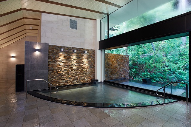 透明感を感じさせるモダンな印象の大浴場は、床から天井まで明るいガラス張り。大浴場の浴槽と露天風呂はガラスを隔てて隣り合っていますので、開放感は抜群です。檜(ひのき)林を眺めながらゆったりとおくつろぎいただけます。