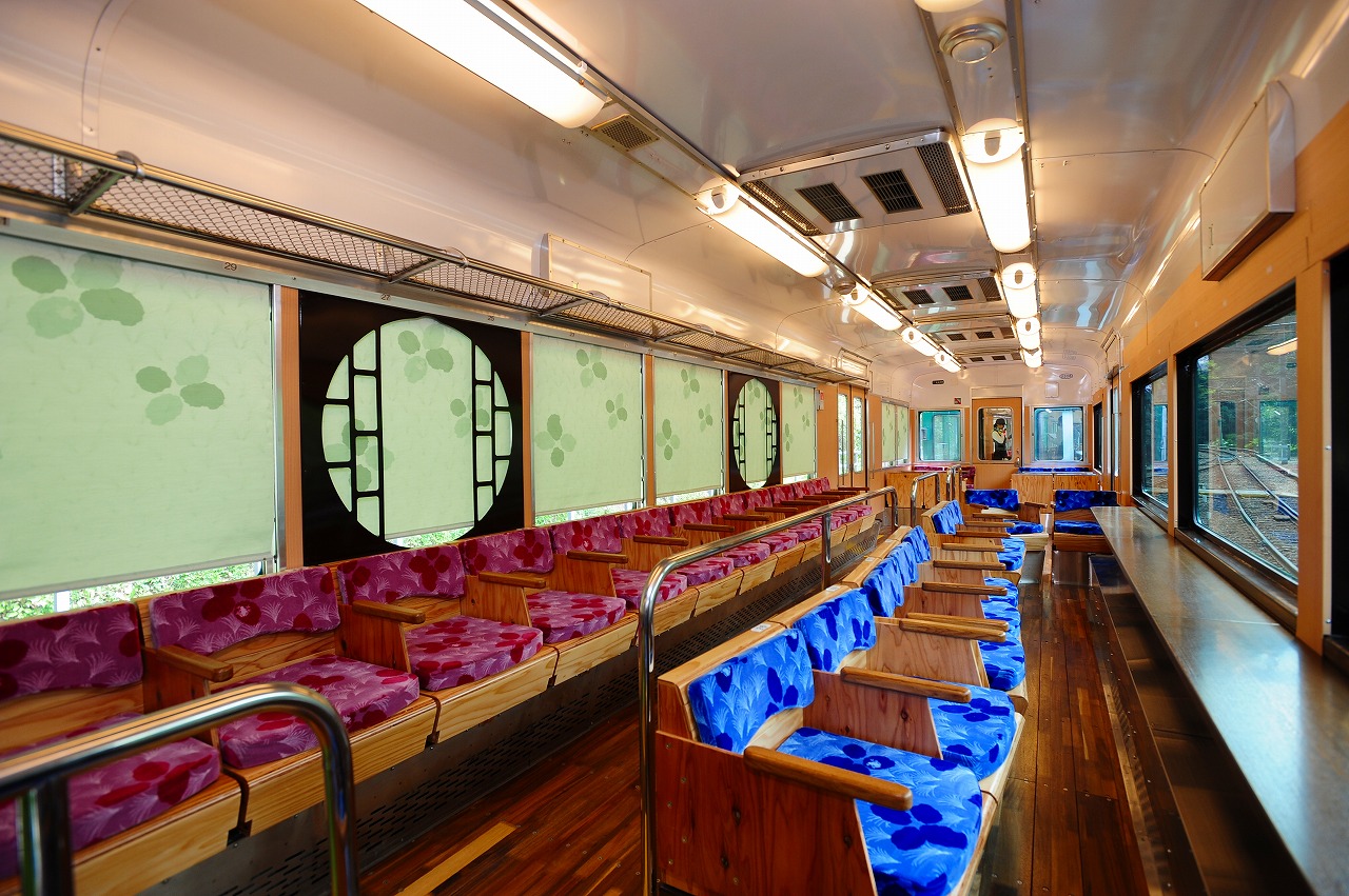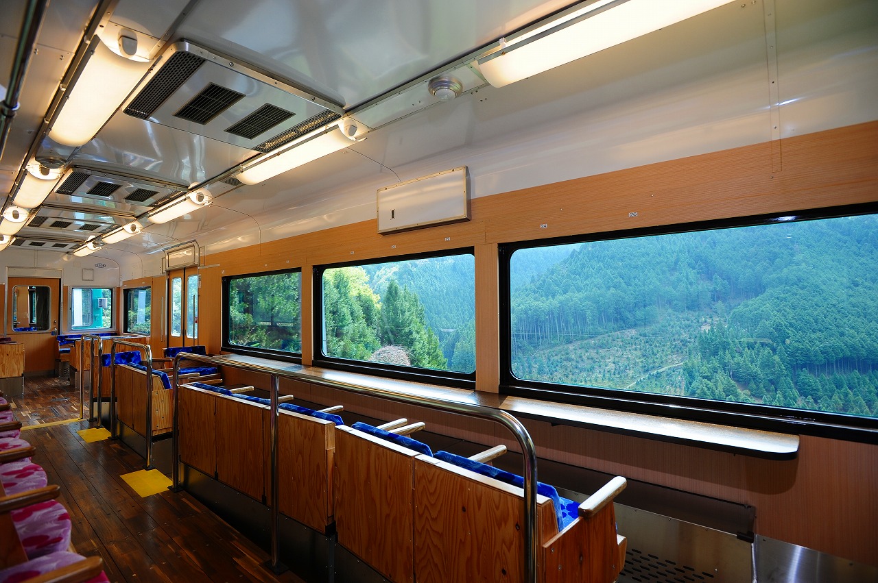 車内の窓は紀の川や不動谷川、険しい山間の風景を一望できるようにワイドとなっています。また、森林の澄んだ空気が吹き抜け、四季折々の気候や匂いなどを楽しむことができる展望デッキもあります。