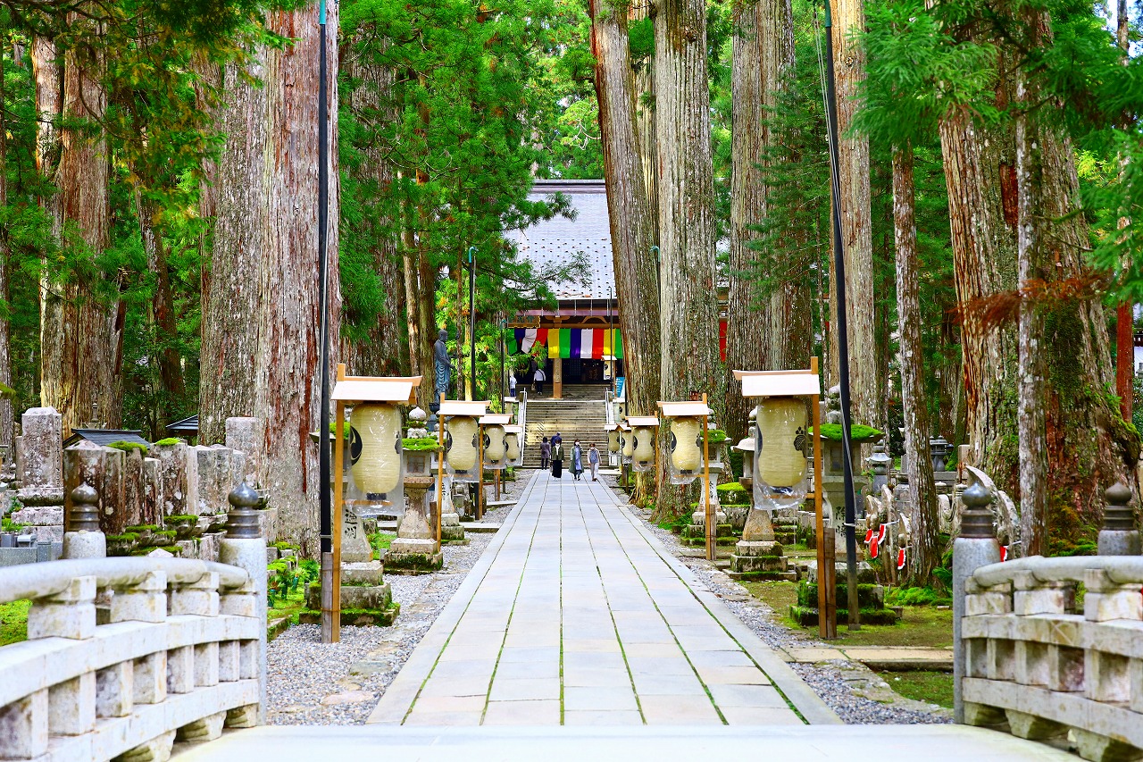 弘法大師空海の御廟がある場所で、壇上伽藍と並ぶ高野山の二大聖地の一つ。高野山の信仰の中心とされています。弘法大師は853年に62歳で入定し、以来1200年にわたってこの地で永遠の瞑想を続けていると信じられています。