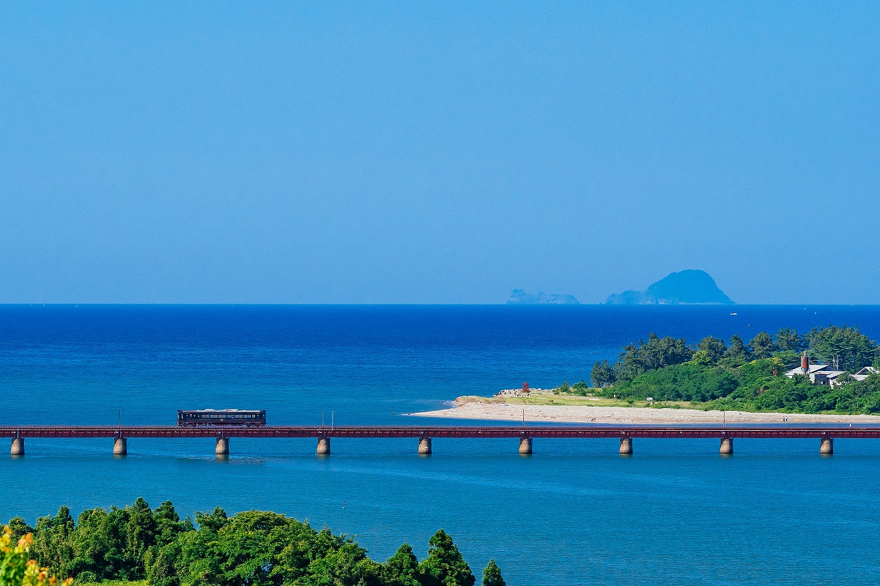 宮津市と舞鶴市を結ぶ長さ約551メートルの鉄道橋をゆっくり走行します。まるで海の上を走っているような景観をお楽しみください。